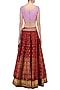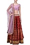 This set features a lavender blouse in silk base with sequins embroidered motifs scattered all over. It is paired with maroon double layer lehenga in silk dupion and net with gold print and mukaish work highlights along with lavender net dupatta.