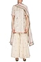 Featuring an off white short kurta in cotton mul base with vertical stripe gota, sequins and thread work embroidery. It is paired with a matching gathered gharara and floral block printed dupatta having pink detailing.
