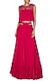 Featuring a hot pink sleeveless cape top in georgette base with zardosi, cutdana and crystals floral embroidery. It is paired with matching skirt having criss cross belt and gathered frills at the bottom including can-can.