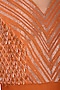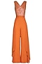 Featuring a rust orange jumpsuit in georgette base with flared skirt palazzo, torso highlighted having transparent layer of net including cutdana lines and crystal embellishments.