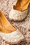 Featuring a pair of beige juttis in croma silk base with zari and anchor thread embroidery. It has a leather underlining and double cushion.