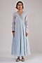 Featuring a blue anarkali jacket in pure cotton base. It is paired with churidar and a kota doria dupatta. Accentuate it with dangler earrings and juttis for a festive occasion, family gathering or intimate pooja ceremony.