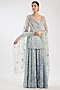 Featuring an exquisite Aqua Sharara crafted in a organza base, adorned with embroidery. It is paired with an embroidered kurta and a dupatta. Elevate this designer ensemble with kundan polki earrings, a sleek hairdo, and embellished block heels for a striking look, perfect for weddings, engagements or sangeet ceremonies.