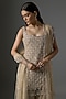 Featuring an exquisite Beige Sharara crafted in a net base, adorned with hand and machine embroidery. It is paired with an embroidered kurta and an embroidered dupatta. Elevate this designer ensemble with kundan polki earrings, a sleek hairdo, and embellished block heels for a striking look, perfect for weddings or engagements or sangeet ceremonies.
