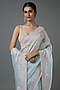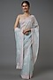 Featuring a blue saree in organza base with sequins and cutdana embellishments. It is paired with a matching blouse having floral jaal embroidery.