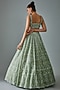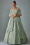 Featuring a blue lehenga in organza base with sequins, cutdana hand and machine embroidery, including a can-can. It is paired with a matching blouse and a dupatta.
