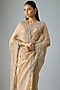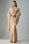 Featuring a gold handloom saree in satin silk base with threadwork. It is paired with an unstitched blouse. Accentuate it with statement earrings and heels for a wedding, sangeet or engagement ceremony.
