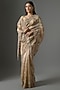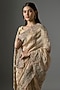 Featuring an exquisite Golden Saree crafted in a tissue base, adorned with hand and machine embroidery. It is paired with an unstitched embroidered blouse. Elevate this designer ensemble with zirconia or swarovski jewellery, a floral hairdo, and embellished block heels for a striking look, perfect for weddings, sangeet or engagements ceremonies.