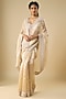 Featuring an exquisite Golden Saree crafted in a tissue base, adorned with hand and machine embroidery. It is paired with an unstitched embroidered blouse fabric. Elevate this designer ensemble with zirconia or swarovski jewellery, a floral hairdo, and embellished block heels for a striking look, perfect for weddings, sangeet or engagements ceremonies.