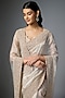 Featuring a grey saree in tissue base with embroidery. It is paired with an unstitched blouse. Accentuate it with kundan polki jewellery and block heels for a sangeet, wedding or engagement ceremony.