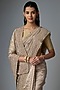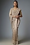 Featuring a grey saree in tissue base with embroidery. It is paired with an unstitched blouse. Accentuate it with kundan polki jewellery and block heels for a sangeet, wedding or engagement ceremony.