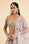Featuring an ivory lehenga in organza base. It is paired with an embroidered blouse and a dupatta. Accentuate it with pearl or swarovski jewellery, block heels and a clutch for a wedding or engagement ceremony.
