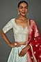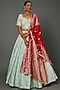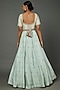 Featuring a mint green lehenga in raw silk base with aari, resham, and zardosi embellishment. It is paired with a matching blouse and a dupatta.