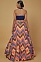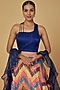 Featuring a multi-colored lehenga in fancy fabric base. It is paired with a contrasting navy blue blouse having jaal work and a dupatta.