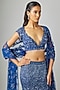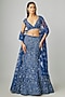 Featuring a navy blue lehenga in net base with embroidery. It is paired with an embroidered blouse and a dupatta. Elevate this designer ensemble with zircon jewellery, a floral hairdo, and embellished block heels for a striking bridal look, perfect for weddings, sangeet or engagement ceremonies.