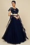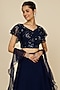 Featuring a navy blue lehenga in tissue organza base. It is paired with a matching blouse having jaal work and a ruffled dupatta.