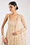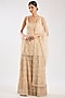 Featuring an exquisite Peach Sharara crafted in a net base, adorned with hand and machine embroidery. It is paired with an embroidered kurta and a dupatta. Elevate this designer ensemble with kundan polki earrings, a sleek hairdo, and embellished block heels for a striking look, perfect for weddings, engagements or sangeet ceremonies.