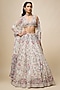 Featuring a peach lehenga in organza base with embroidery. It is paired with an embroidered blouse and a dupatta. Accentuate it with zirconia or swarovski jewellery, block heels and a clutch for a destination wedding or engagement ceremony.