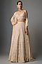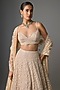 Featuring a pink lehenga in net base. It is paired with a blouse and a dupatta. Accentuate it with traditional kundan or temple jewellery, a soft braided hairstyle or classic bun, and embellished juttis or heels for a timeless ensemble, ideal for wedding, engagement or sangeet ceremonies.
