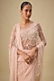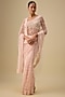 Featuring a pink saree in net base with hand and machine embroidery. It is paired with an unstitched blouse. Accentuate it with diamond jewellery and heels for a bridal, engagement or a reception look.