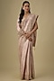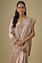 Featuring a pink saree in silk base with hand and machine embroidery. It is paired with a stitched blouse. Accentuate it with diamond jewellery and heels for a bridal, engagement or reception look.