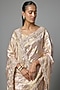 Featuring a pink saree in tissue base with embroidery with a running blouse fabric. Accentuate it with kundan polki stud earrings, a polti bag and juttis for festive occasion or sangeet ceremony.