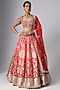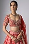 Featuring a red lehenga in banarasi base. It is paired with a raw silk blouse and a net dupatta. Accentuate it with statement jewellery, a clutch and heels, perfect for weddings or a bridal look.