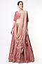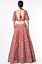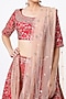 Featuring a red lehenga in net base with gota embellishments. It is paired with a matching blouse and a peach net dupatta.