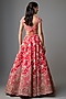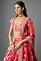 Featuring a red lehenga in raw silk base. It is paired with a blouse and a dupatta. Accentuate it with traditional kundan or temple jewellery, a soft braided hairstyle or classic bun, and embellished juttis or heels for a timeless bridal look.