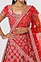 Featuring a red lehenga in raw silk base with zardosi, moti, and aari embroidery. It is paired with a matching blouse and a dupatta.