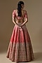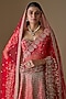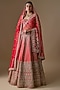 Featuring a red lehenga in raw silk base with zardosi hand embroidery. It is paired with a blouse and two net dupattas. Accentuate it with statement jewellery, a clutch and heels, perfect for weddings or a bridal look.