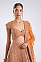 Featuring a rust lehenga in raw silk base with zari hand and machine embroidery. It is paired with an embroidered blouse and dupatta. Elevate this designer ensemble with kundan polki jewellery, a floral hairdo, and embellished block heels for a striking bridal look, perfect for weddings or engagements ceremonies.