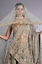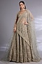 Featuring a turquoise lehenga in velvet base. It is paired with a blouse and two dupattas. These opulent lehengas with intricate embroidery and rich detailing are perfect for a bridal wear, styled with green polki jewellery for an unforgettable bridal statement.