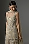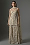 Featuring an exquisite White Sharara crafted in a net base, adorned with hand and machine embroidery. It is paired with an embroidered kurta and a dupatta. Elevate this designer ensemble with kundan polki earrings, a sleek hairdo, and embellished block heels for a striking look, perfect for weddings, engagements or sangeet ceremonies.