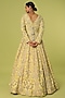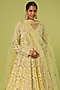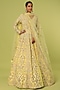 Featuring a yellow handcrafted jacket in raw silk base with embossed zardosi and thread embroidery. It is paired with a matching hand embroidered lehenga and a dupatta.