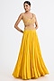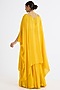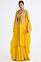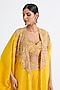 Featuring a yellow cape in habutai silk base with embroidery. It is paired with an embroidered blouse and a lehenga. Style this designer set with a pair of heels and jewellery for a festive, sangeet or haldi ceremonies.