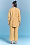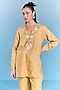 Kalista presents an amber yellow top in cotton linen base shirt with a v-neckline, floral and lace embroidery. Elevate with pants, metallic heels, subtle gold accessories, and soft curls for effortless elegance, perfect for intimate gatherings, rakhi celebrations, or low-key festive evenings.