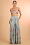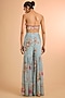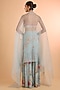 Featuring a blue blouse in viscose silk base. It is paired with georgette gharara pants and an organza cape. Accentuate it with delicate kundan or pearl jewellery and embellished heels for a stylish ensemble, ideal for mehendi ceremonies, festive celebrations or elegant evening soirees.