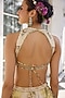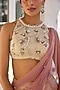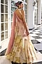 Kalista features an ecru lehenga in tissue base with floral print. It is paired with an embroidered halter neck blouse and a blush pink butterfly net dupatta. Style it with statement chandbalis, soft curls, and embellished heels for a glam-yet-traditional sangeet or engagement look.