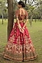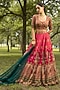Presenting an elegant fuchsia dola silk lehenga set with intricate hand embroidery and enchanting hand painted print. The lehenga set includes a matching blouse and a contrasting dupatta. The set is crafted with the finest materials and will accentuate a sangeet, bridesmaid or trousseau look.