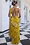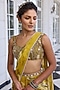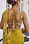 Kalista features a golden yellow draped saree in viscose georgette base with floral print. It is paired with an olive green butterfly net blouse having sequins and beads hand embroidery. Ideal for engagement, mehendi or festive parties where modern glamour meets Indian elegance.
