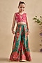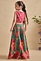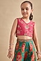 Featuring a green cape for girls in organza base. It is paired with a hot pink blouse, including hot pink and green sharara pants. Style it with sandals and a matching hairband for a cute and comfortable festive look, perfect for special occasions or weddings.