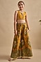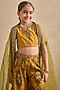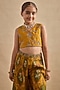 Featuring a lime green cape for girls in organza base. It is paired with a mustard viscose silk blouse, including lime green and mustard sharara pants. Style it with sandals and a matching hairband for a cute and comfortable festive look, perfect for a haldi ceremony or special occasion.