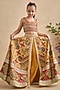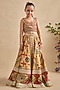 Featuring a yellow and multi-colored lehenga for girls in viscose silk base with hand painting, floral motifs print and embroidery. It is paired with palazzo pants and a blouse. Style it with sandals and a matching hairband for a cute and comfortable festive look, perfect for family gatherings, festive poojas or cultural celebrations