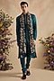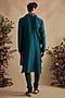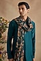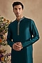 Featuring a midnight green kurta in chanderi silk base. It is paired with churidar pants and a floral dupatta. Accentuate it with neutral mojaris or classic kolhapuri-style footwear and a sleek watch for a refined finish, ideal for festive gatherings or pre-wedding functions.