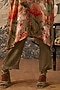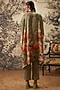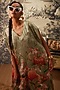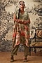 Featuring a sage green kaftan set with a relaxed and chic silhouette printed elegantly with botanical motifs. It is styled with a pair of striped straight pants.