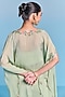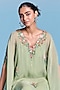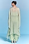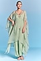 Kalista presents a mint green kaftan in organza base with sequins and thread embroidery. It is paired with an inner and viscose pants. Elevate with metallic heels, subtle gold accessories, and soft curls for effortless grace, perfect for intimate get-togethers, rakhi celebrations, or low-key festive evenings.