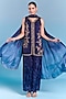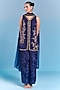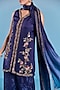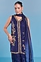 Kalista presents a navy blue kurta in viscose satin base with sequins and floral embroidery. It is paired with printed pants and a silk dupatta. Elevate with metallic heels, subtle gold accessories, and soft curls for effortless grace, perfect for intimate get-togethers, rakhi celebrations, or low-key festive evenings.