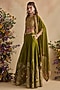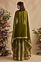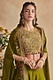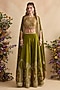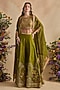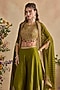 Featuring a mustard yellow corset in viscose silk base with zari, threadwork and hand embroidery. It is paired with sharara and an olive green organza cape. Accentuate it with jewellery and heels for festive celebrations, mehendi or wedding ceremony.