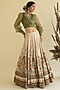 This occasion-ready white lehenga in dola silk is enhanced with an enchanting floral print in a myriad of hues, complementing the look with a contrasting olive green blouse crafted in organza. Style the look with dangler earrings or a statement necklace and make it a perfect fit for a sangeet, bridesmaid, or trousseau look.